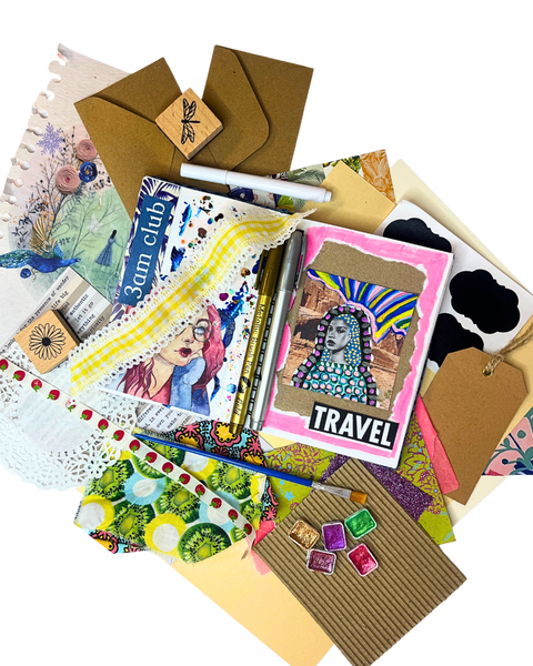 A journal, word stickers, pretty papers, metallic watercolours, Mod Podge and other satisfying supplies.